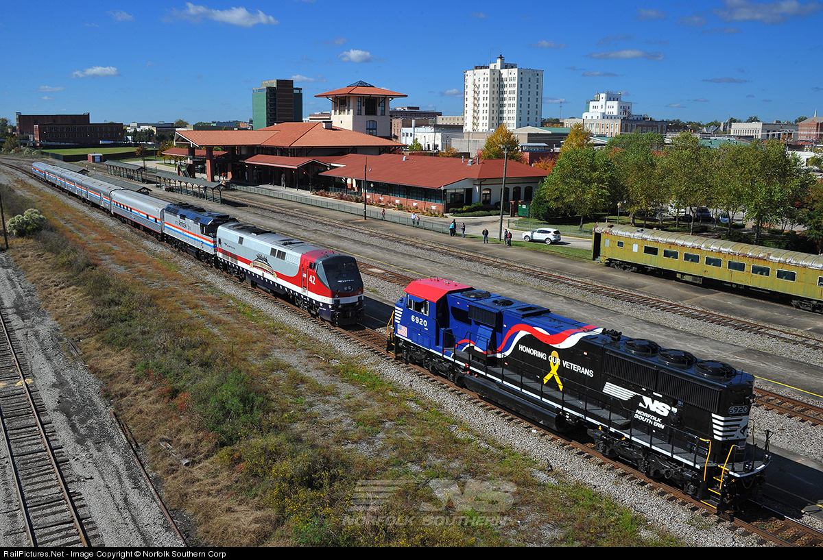| Amtrak train 958 arrives Meridian from New Orleans with the display equipment for Meridian Railfest. A few moves would be made shortly after this image to seperate all of the engines for display on the "City Track", nearest the station. Photo by Casey Thomason. For more information about Norfolk Southern, visit www.nscorp.com |