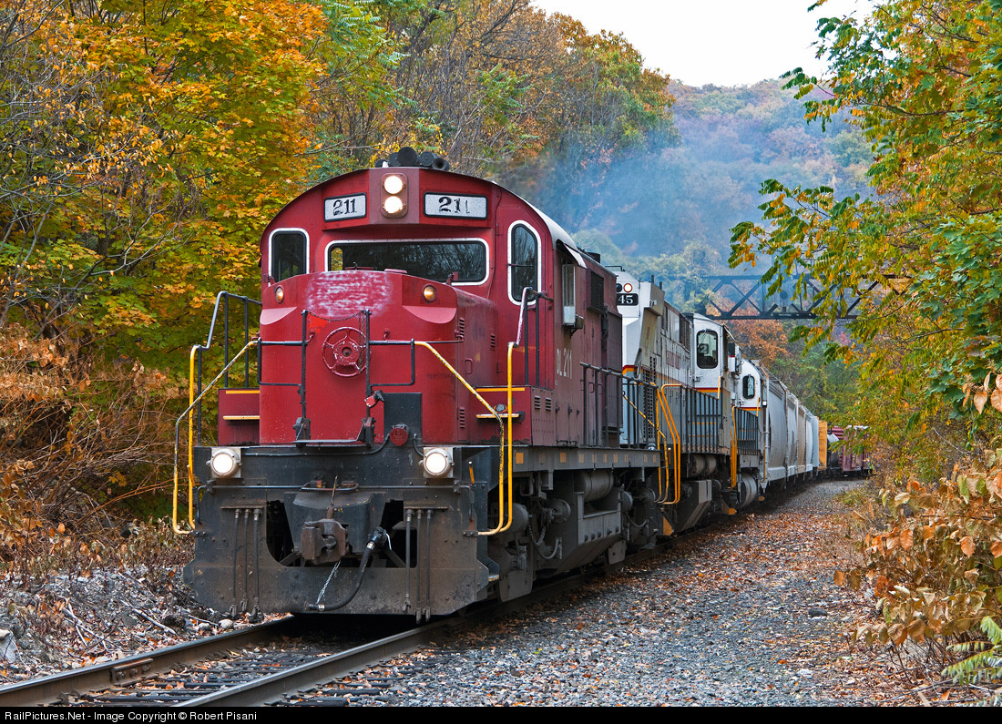 | PT-98 tackles the eastbound grade out of Scranton with DL 211 (RS32), MHWA 2045 (M420W) and DL 3642 (C636) in the lead. The train has just passed through Nay Aug Park where there is still a bit of autumn color remaining. |