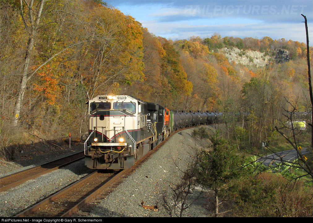 A colorful combo of power leads another Philly oil train around the tight curves for Smith's Landing where the crew will meet two northbound intermodals at CP-102 at West Camp on a beautiful fall morning.