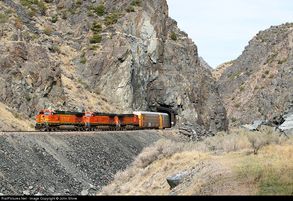 A trio of GE's exit one of the tunnels in scenic Wind River Canyon as they head South with a Laurel, MT- Lubbock, TX train.