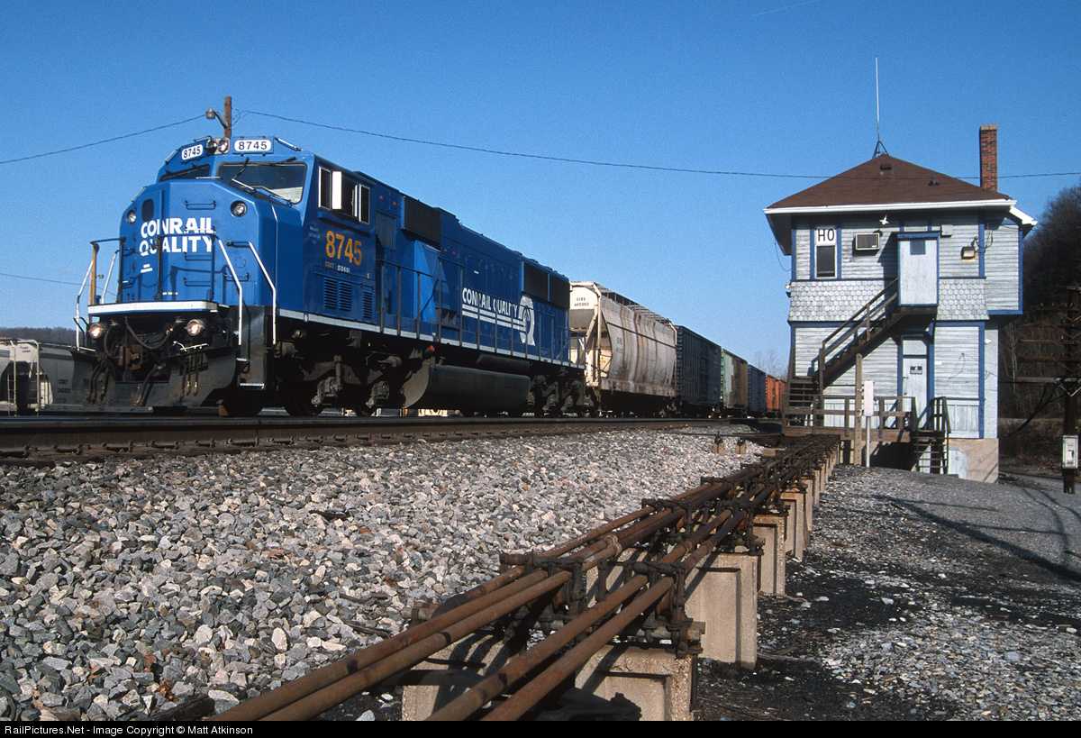 Ex-Conrail SD60I 8745 runs west past HO Tower on CSX's Cumberland Subdivision in 2000.