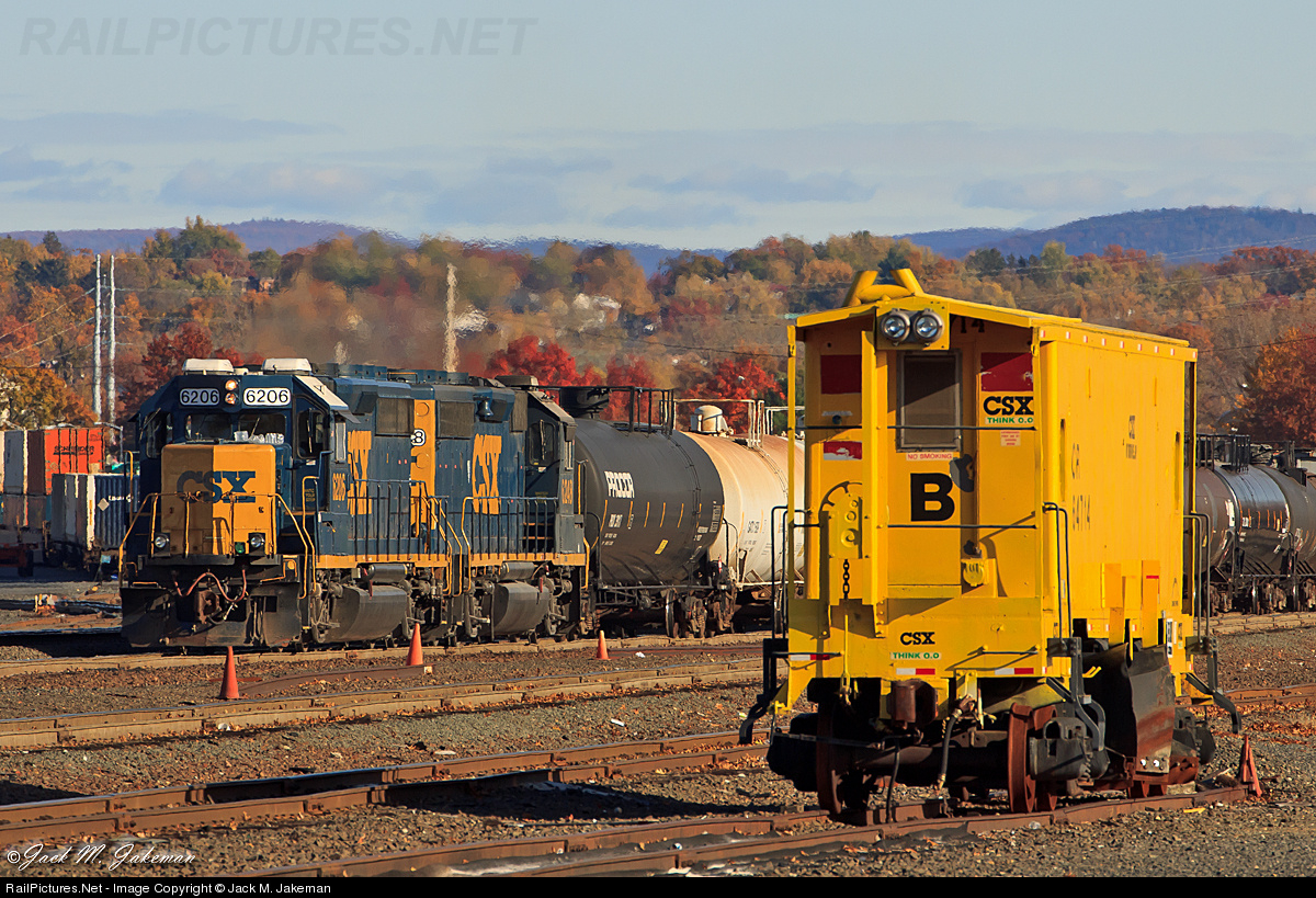 A pair of CSXT GP40-2s shove a cut of tankers back through the yard while a former Conrail flanger sits by on a stub track patiently waiting for snow to fly . It appears the flanger hasn't moved in some time as evident by the heavy rust on the wheels.