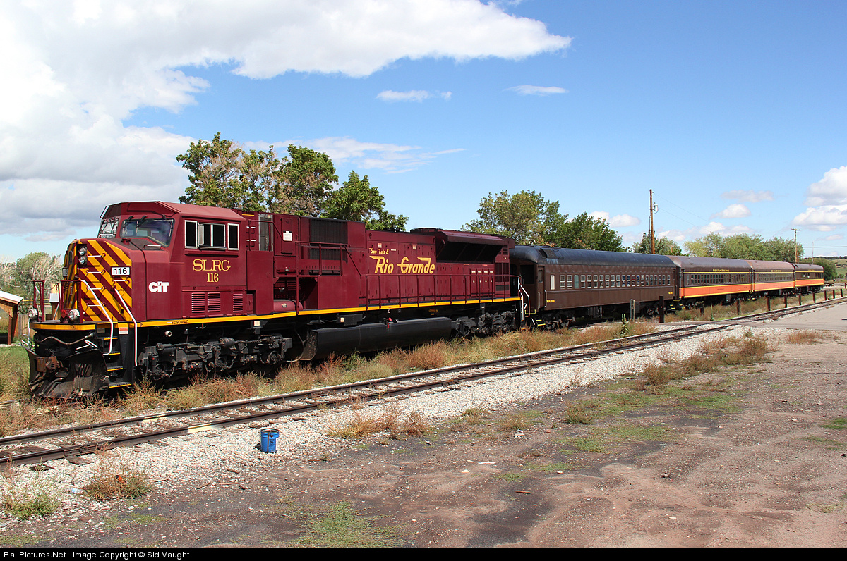 | Rio Grande Scenic runs excursions over La Veta pass from Alamos and La Veta. To handle charters westbound this grossly overpowered consist is laying over on the east end. If you come to the narrow gauge don't miss this spectacular and historic standard gauge run. |