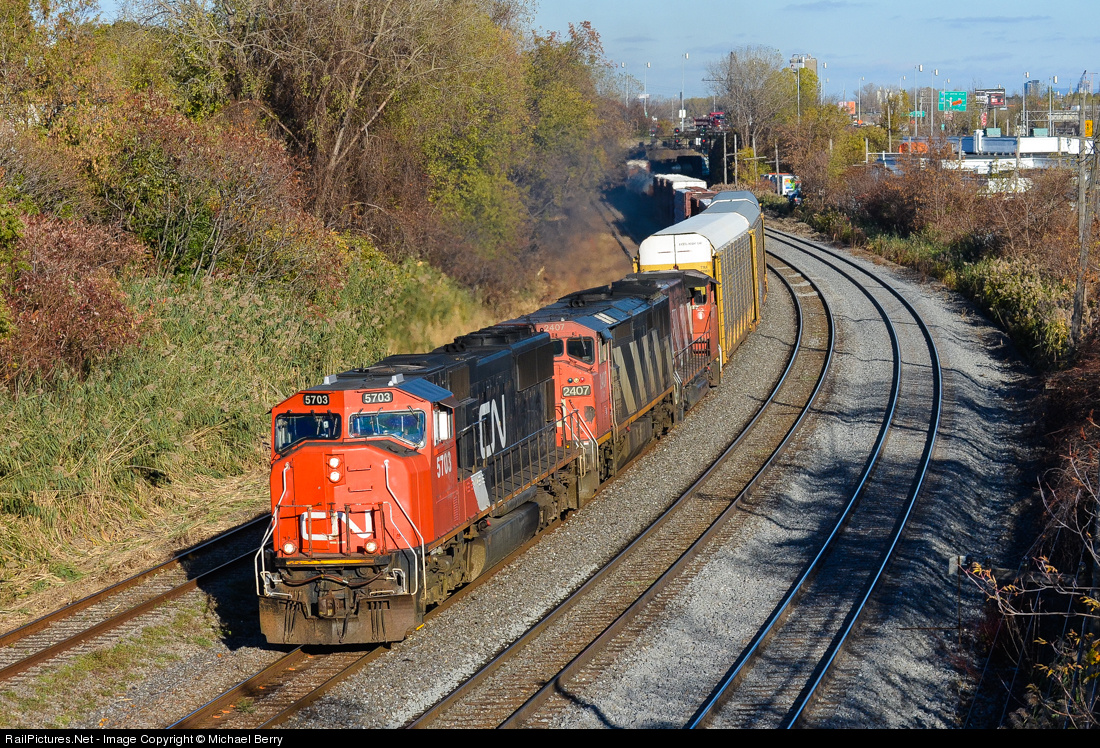CN 401 with CN 5703, CN 2407 & CN 4789 heads west. CN has been doing trackwork here recently, notice the fresh ballast to the right of the train. For more train photos, check out http://www.railpictures.net/photos/mtlwestrailfan/