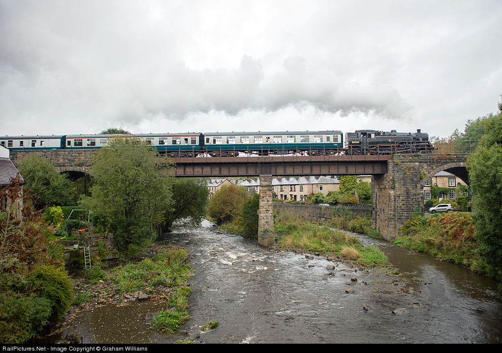 | Standard tank no. 80080 crosses Brooksbottom Viaduct, Summerseat in the pouring rain at the East Lancs. Railway. Autumn Steam.Gala. |