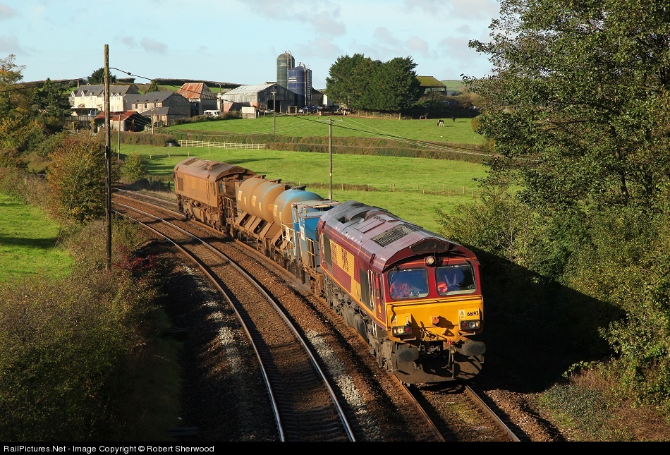 | 66193 and 66187 top n tail 3J14 08:32 St Blazey to Par via Newton Abbot RHTT past Follaton on Sunday 10th November 2013 |