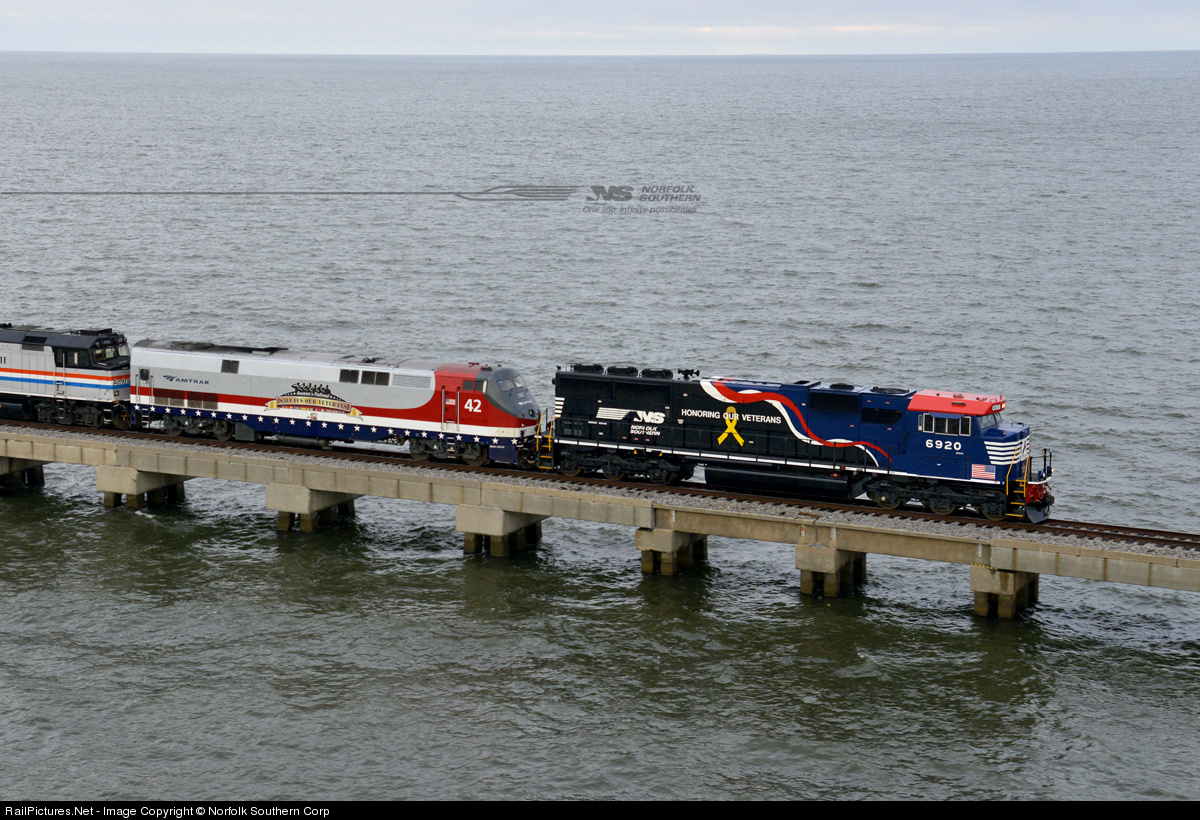 Happy Veteran's Day! Norfolk Southern and Amtrak would like to take the opportunity to honor and thank all of our veterans and military for their service to our country. NS and Amtrak teamed up on November 1st to move their "Veterans" locomotives and the Amtrak Exhibit Train from New Orleans to Meridian, Mississippi, for display at the annual Meridian Railfest on November 2nd. Here the train is seen crossing Lake Pontchartrain as it speeds north, following the daily northbound Amtrak Crescent. Photo by Casey Thomason. For more information about Norfolk Southern, visit www.nscorp.com