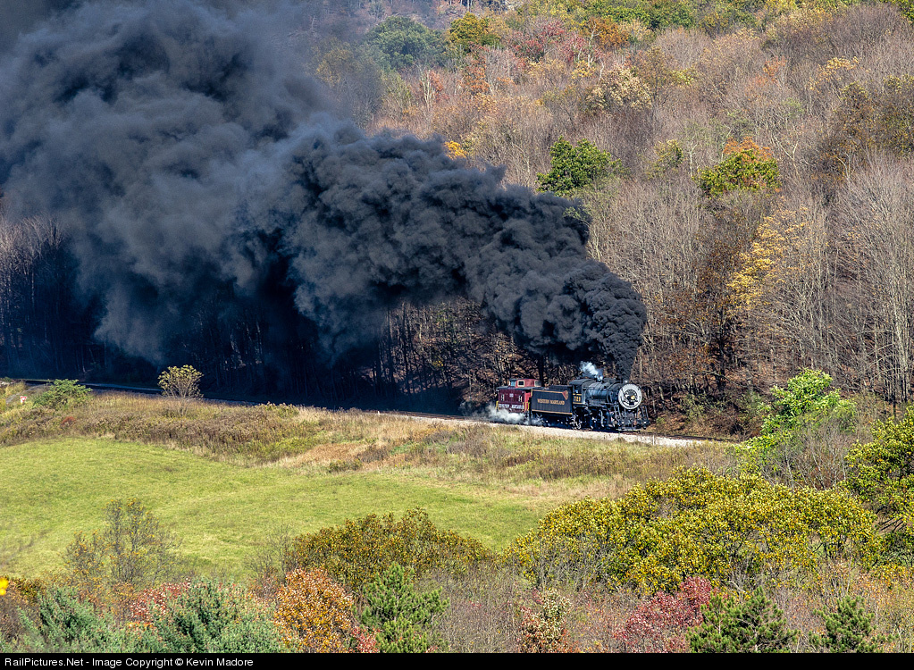 Charter Outtakes: "729 bring it ahead. Give us a little smoke." One of the staples of steam photo charters is the smoky run-by. Although a properly fired steam locomotive usually doesn't smoke all that much, most photographers like a decent smoke plume to lead the viewer's eyes to the train...particularly in wide, landscape shots. So it was on this trip that as two dozen photographers prepared to shoot a Western Maryland Consolidation across the valley at Woodcock Hollow, charter operator Pete Lerro radioed the engine crew with the customary request for a little smoke. Perhaps the crew was ready to have a little fun with Pete and his patrons. The resulting run-by was a rather dramatic re-enactment of the 79 AD eruption of Mount Vesuvius that destroyed the ancient Roman city of Pompeii. Had the 729 been heading up or pushing a heavy freight, the resulting plume might have been semi-believable....but for a caboose hop? Well, it definitely brought a few smiles and chuckles to the assembled photo line. Needless to say, Pete had 'em back 'er up and do it again. It probably took 5 minutes for the smoke to completely clear. On the next pass, the 729's exhaust was considerably more modest.