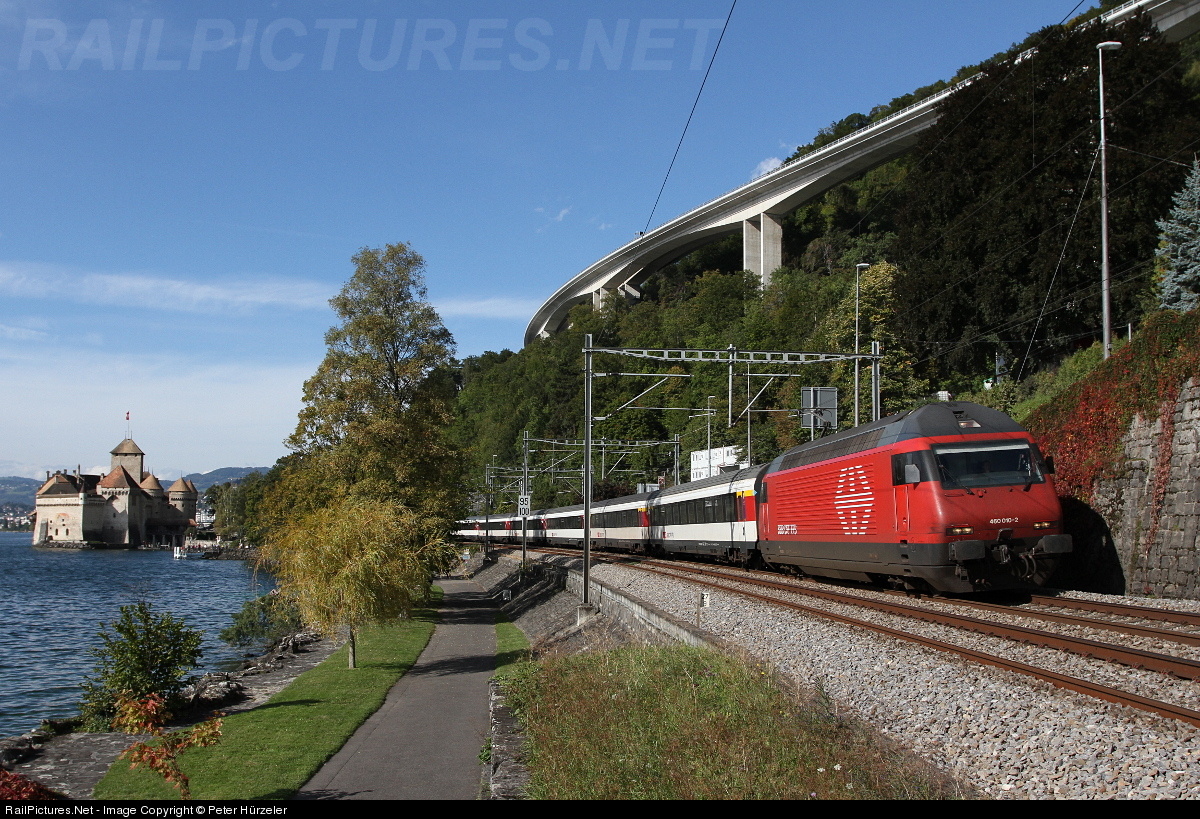 | On this sunny autumn afternoon the Re 460 010-2 is pulling in Interregio train completely in the new SBB design along the Lac Léman. The train is just passing the famous Château de Chillon on its way up the Rhone valley to it's final destination Brig. |