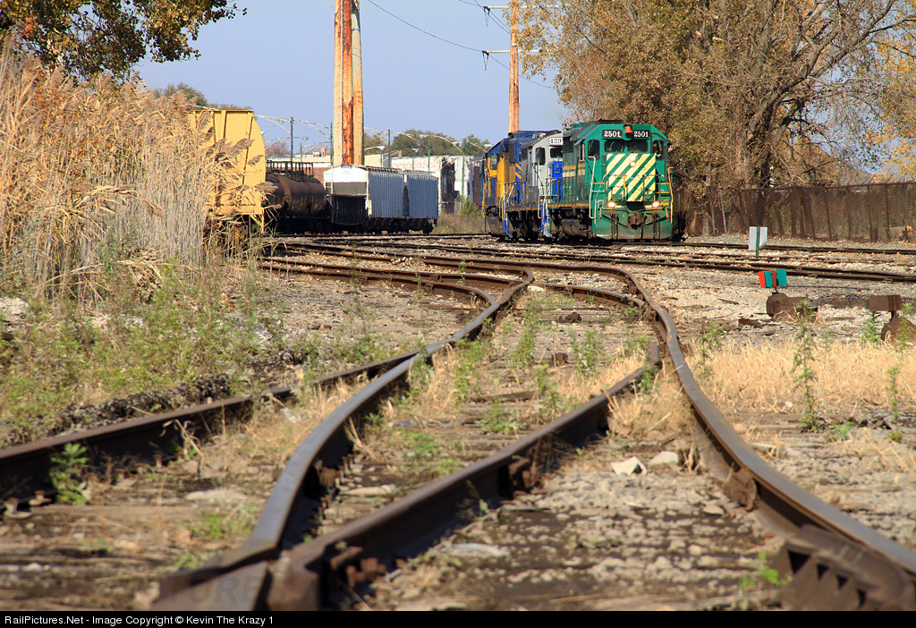 | Still wearing its Hudson Bay livery, OMLX 2501 heads south along Torrence Ave. Between 106th St and 122nd St, the Chicago Rail Link is littered with yard tracks and industries including the ex C&NW's Irondale Yard. |