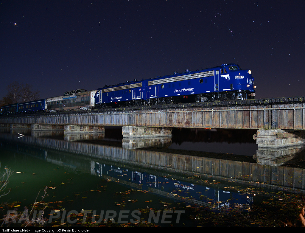 Pan Am ran a rare evening trip with their Office Car Special train and newly-acquired ex-Wabash dome car on October 12, as the train rolled from Portland, Maine to Rotterdam Junction, New York. Seen at Schagticoke, New York, the PAR 1 and 2 FP9As lead the Dome Lounge 102 (ex-Wabash 201), and Business Cars 101 and 100. A double exposure was used here to provide the starry skies and a trio of AlienBees B1600 illuminated the 25 mph train as it passed over the bridge.
