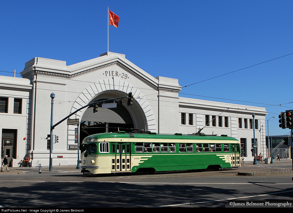 A San Francisco Municipal Railway PCC 'Torpedo' rambles north along The Embarcadero at Pier 29. Double-ended car 1006 was built new for San Francisco MUNI in 1948.