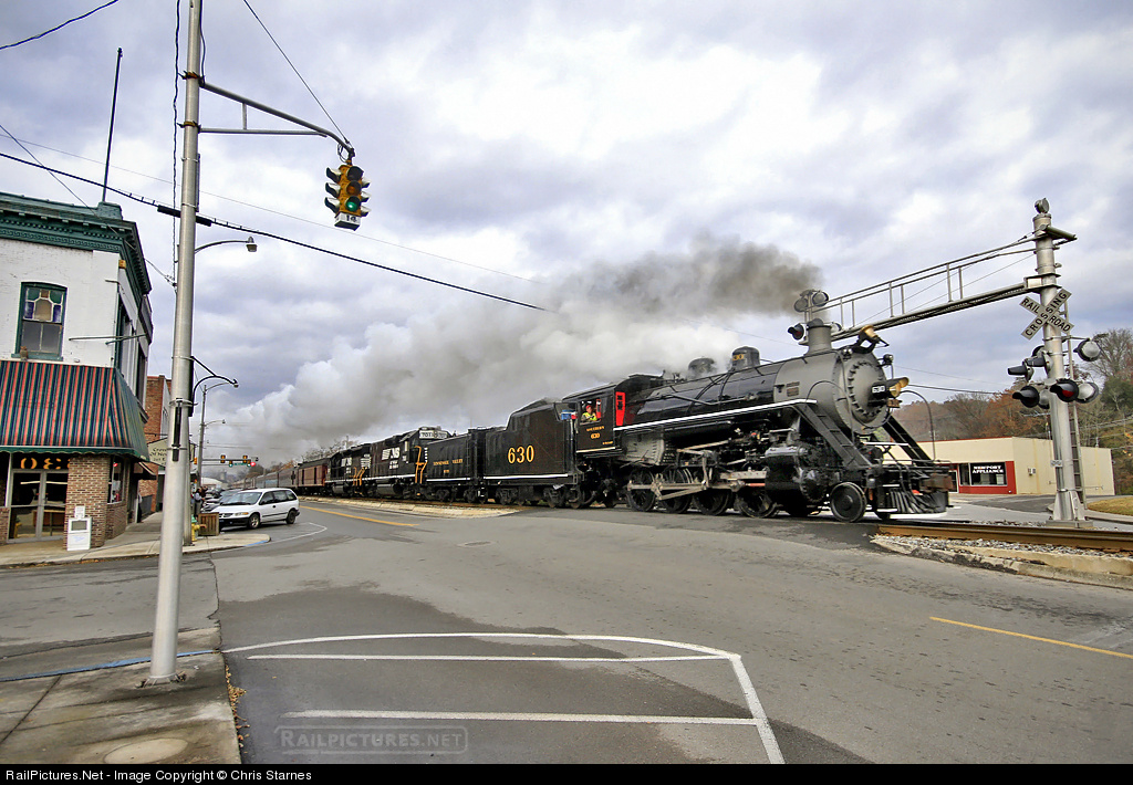 | TVRM's former Southern Railway 2-8-0 #630 leads a Knoxville-Asheville excursion through downtown Newport, TN as it passes the classic four way traffic signal at the intersection of Mims Avenue and Main Street. |