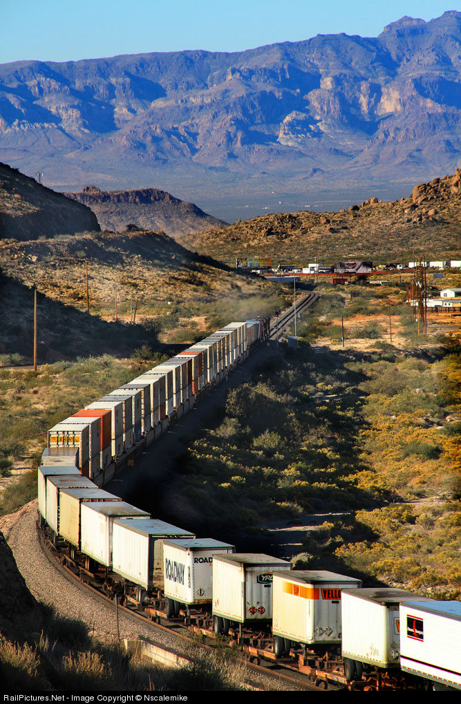Early morning along the Seligman Sub, sees this westbound TOFC running downgrade through Kingman Canyon on this Veterans Day 2013