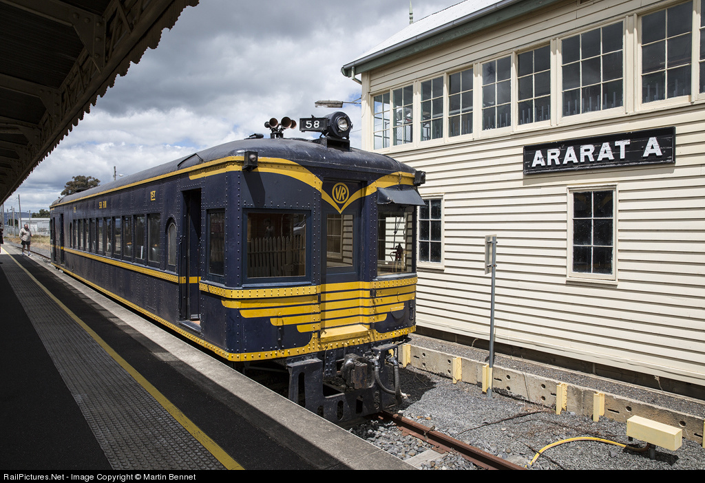 | Diesel Electric Rail Motor No.58RM has just arrived into the broad gauge platform at Ararat, being the first fan trip to operate here since the line from Ballarat reopened to traffic in 2004. The signal box to the right has been moved from its original location in the yard, and is now part of a small museum. You can see some footage taken from the railmotor on this trip here: http://www.youtube.com/watch?v=QxzS8ud17ws |