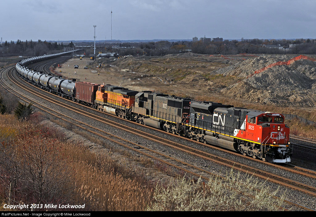The sight of a unit tank train on CN's Kingston Sub is somewhat rare, unlike CP's Belleville Sub, where they've been common for a few years now. This seems to be changing now, as this 710 train is supposed to be the new route of the one that blew up Megantic, Quebec, replacing CP's 606/607. CN 8825, IC 1022, and BNSF 4011 do the honours. Take a close look at the rear of IC 1022... you can see the 'C' of the CN noodle that someone has applied to the rear. 1409hrs.