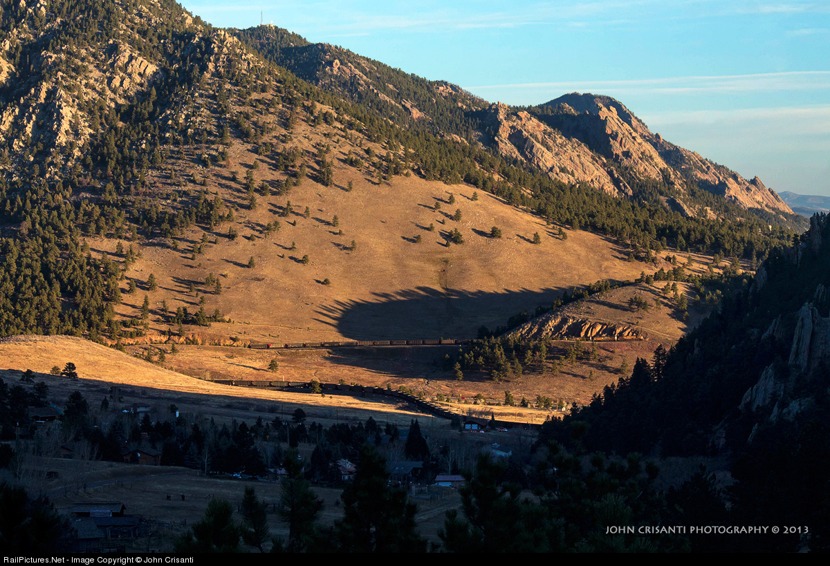 The morning sun starts to illuminate Coal Creek Canyon as a westbound empty coal climbs the grade towards Tunnel #1 near Blue Mountain Road.