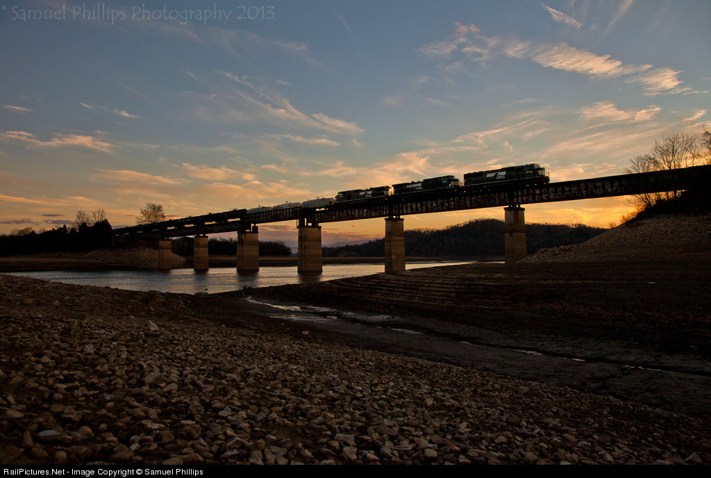 On a quiet and calm evening in Southeastern Tennessee, westbound manifest train No. 165 rumbles across the ex-Southern viaduct at Leadvale, just after sunset, led by an ex-Conrail SD60I. The train has traversed the highly scenic S Line from Asheville, Nc., and is en-route to Sevier Yard in Knoxville.