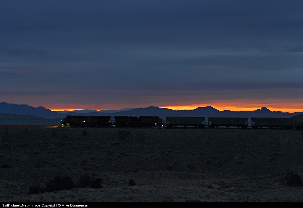 | As dawn arrives on March 6, 2012, a Union Pacific grain train grinds around Arnold Loop, Nevada, pulled by two GE AC4400CWs. |