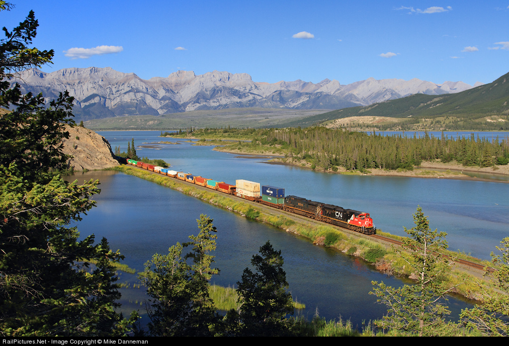 Canadian National train No. 117 passes Windy Point west of Devona, Alberta, on July 16, 2013. This westbound train only has a few more miles before a quick crew change at Jasper, as it passes beautiful Jasper Lake and the rugged scenery in Jasper National Park.
