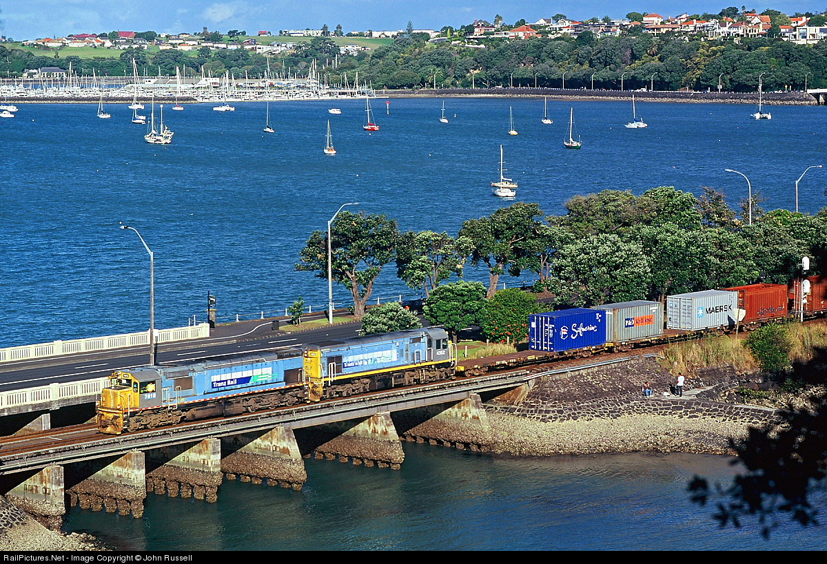 Trains on 3' 6" (1.067m) track from Whangarei to Bluff with virtually heritage rebuilt EMD and GE locomotives still the mainstay power. The network was privatized in 1990's and operated by Toll until 2008 when state owned KiwiRail was established.