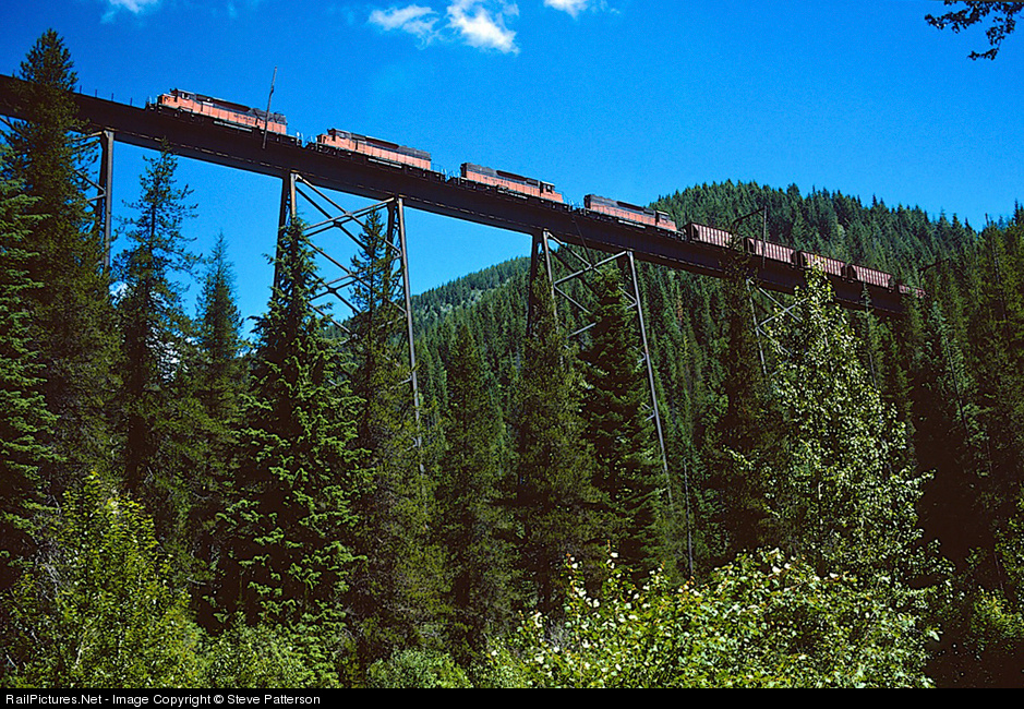 Where electrics formerly ruled, Milwaukee Road Extra 21 East was reaching for the sky near Adair, Idaho on July 19, 1978 as it climbed the 1.7% grade toward St. Paul Pass and Montana in the Bitterroots Mountains. The route is a hiking trail today. One catenary support was still standing on the trestle, above the 2nd car.