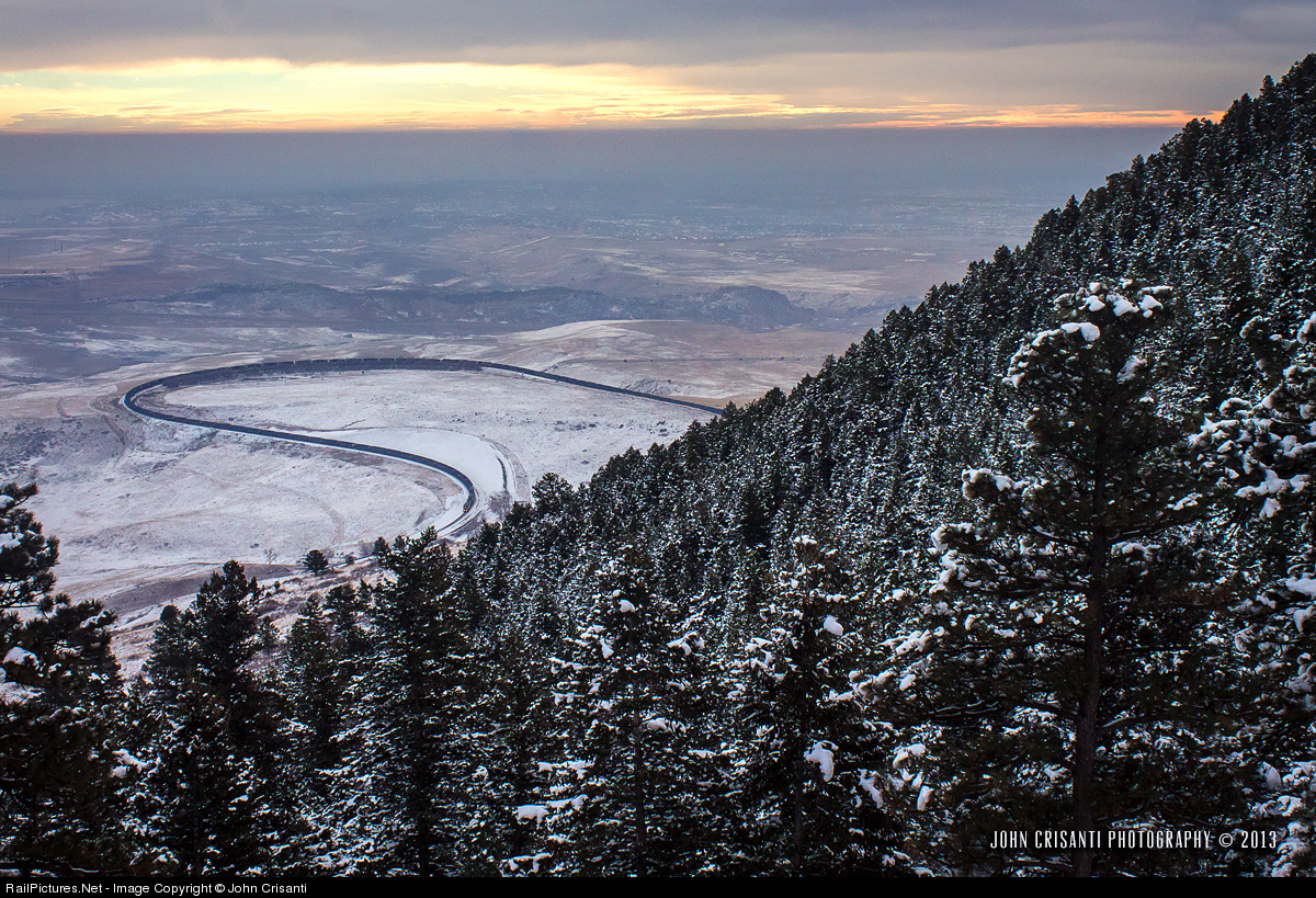 In this cold scene, a loaded coal train led by three UP GE's including a patched Chicago and Northwestern unit leading, negotiates the Big Ten Curve just west of Denver.