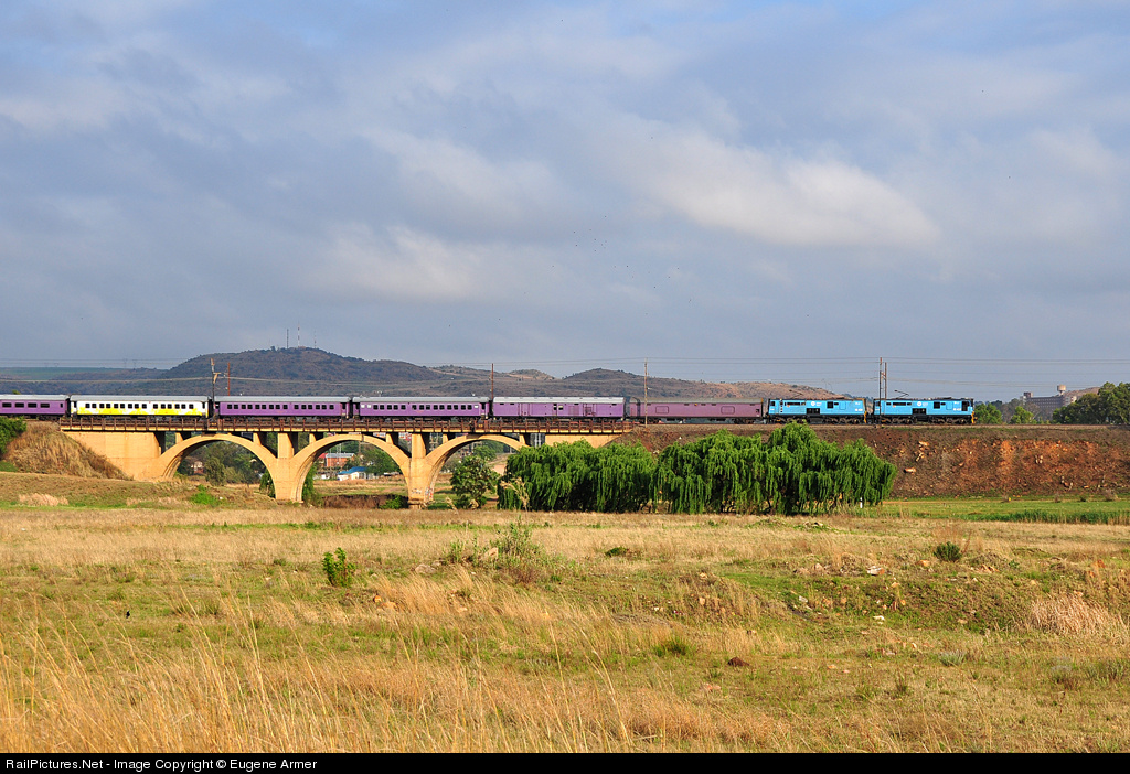 | On the last weekend of each month a Premier Classe train is scheduled to run from Johannesburg to Durban and return. On a totally overcast Monday morning, the sun broke through the clouds long enough to light up this scene of two class 18E's in PRASA livery heading north through Heidelberg with the return working to Johannesburg. The 5th coach is still wearing the "kwaZulu-Natal Tourism Train" livery. |