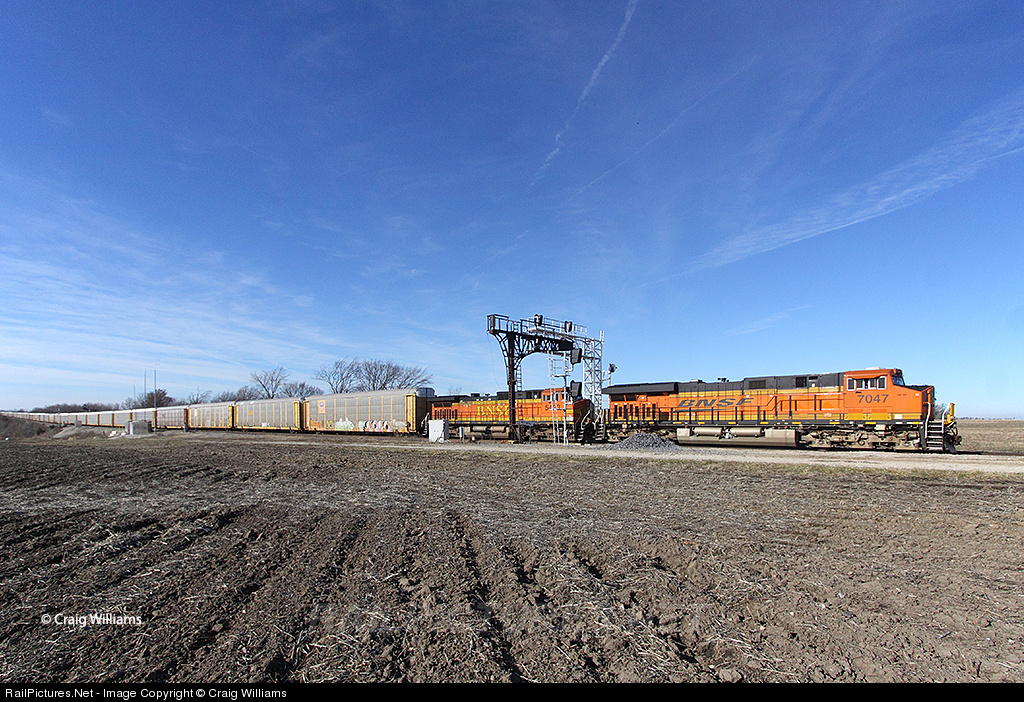 This Clovis, NM< to Logistic Park, IL, vehicle train passes thru West Medill. At West Medill the new signals are in and working, and the ex-Santa Fe cantilever signal bridges sit and wait for BNSF to pull them down which will end an era. This train is about 30 miles west of Ft. Madison, IA.