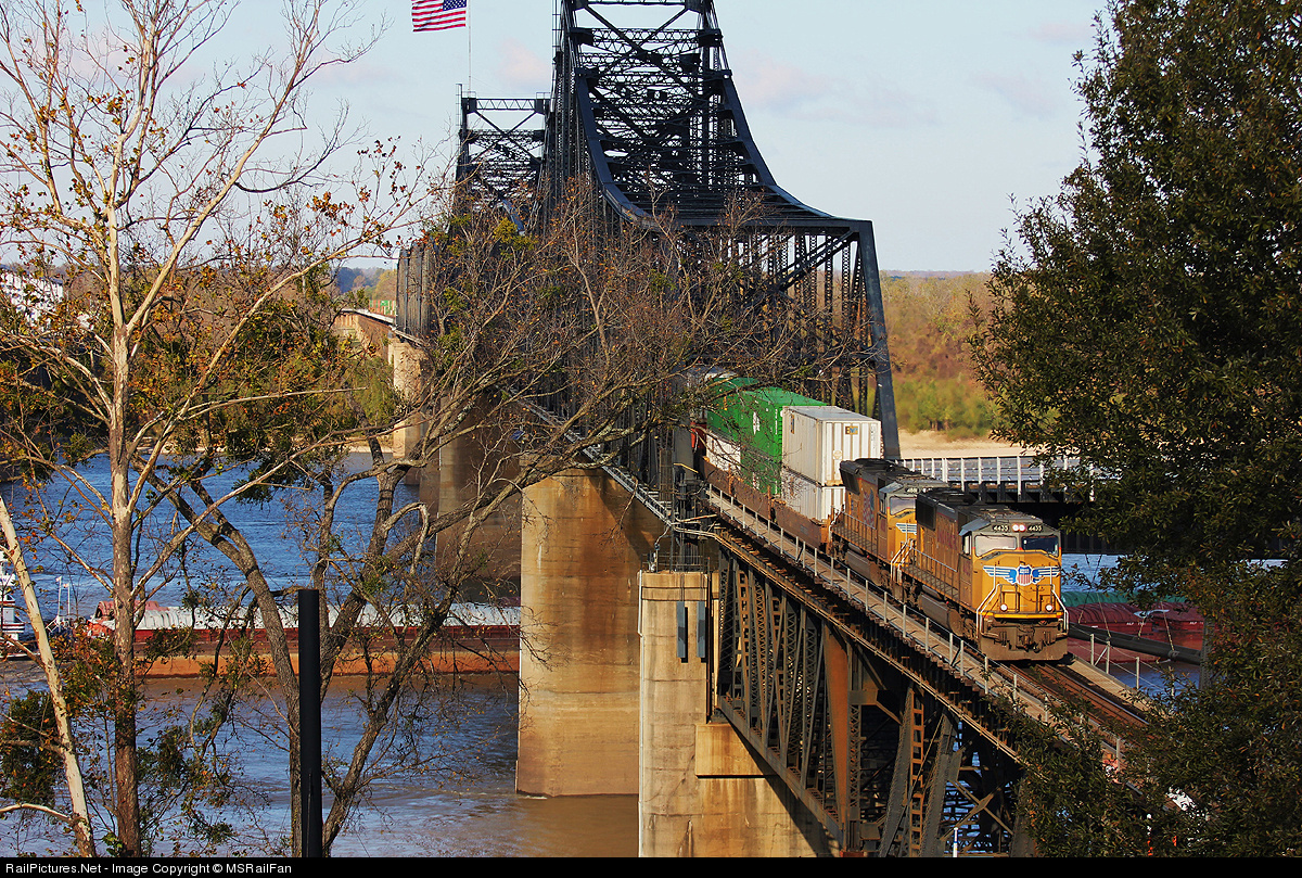 | Vicksburg always provides a nice shot, especially in Fall weather. There just happened to be a barge traveling under the bridge at the right time to capture both boat and rail activity. Now, if there was only a plane... |