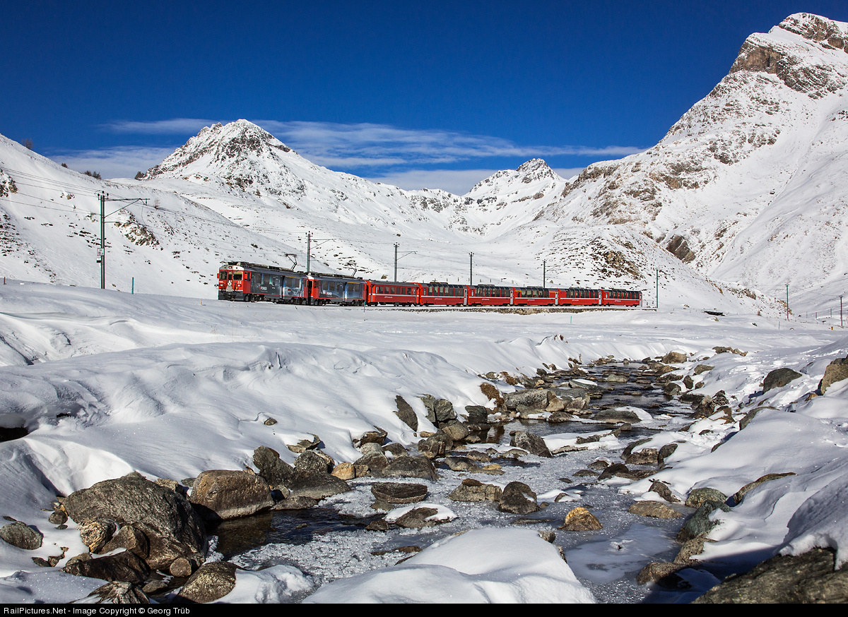 ABe 4/4 # 55 "Diavolezza" and # 56 "Corviglia", both with publicity paint scheme for REPower (Electricity supply company) are pulling the Bernina Express with cars from Chur to Tirano on the Alp da Buond with partly frozen Diavolezza creek in the foreground.