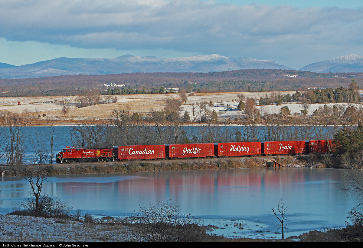 The 2013 Canadian Pacific Holiday Train crosses the causeway over Charter Marsh just south of Ticonderoga, NY on a cold Thanksgiving Day. The north end of the narrow section of Lake Champlain is in the background. Behind the lake is Vermont and the now white Green Mountains.