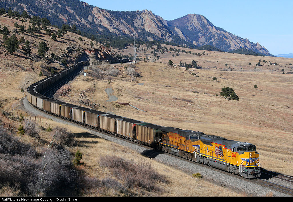 UP 8799 heads Eastbound through Eisele, formerly Clay siding as the Flatirons loom in the background.