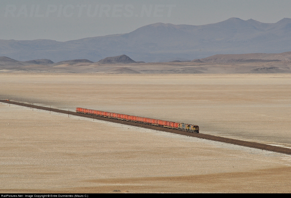 | Southbound FCAB ore train, crossing a long straight, in the middle of the great salt lake Carcote, up to Ascotan. |