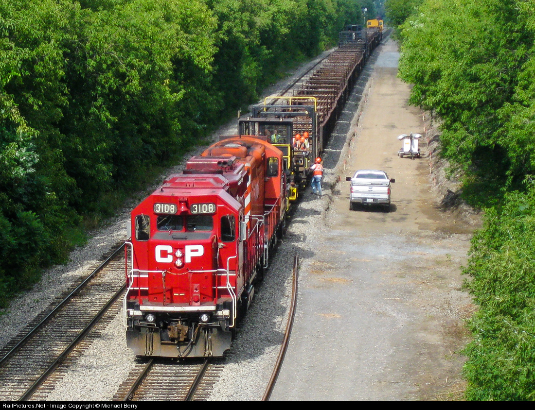 A CP rail train is laying down ribbons of continuous welded rail on CP's Westmount Sub, which normally only sees AMT passenger trains. The power is CP 8231 & CP 3108, and non-graffitied, multimarked van 434957 is on the rear. For more train photos, check out http://www.railpictures.net/photos/mtlwestrailfan/