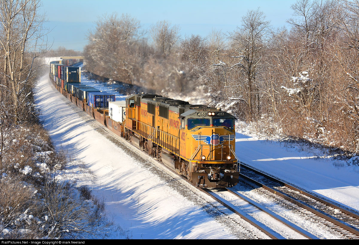 The first snowfall of the year has hit the western new york area , a eastbound csx double stack train just past mp 427with union pacific power running on csx rails