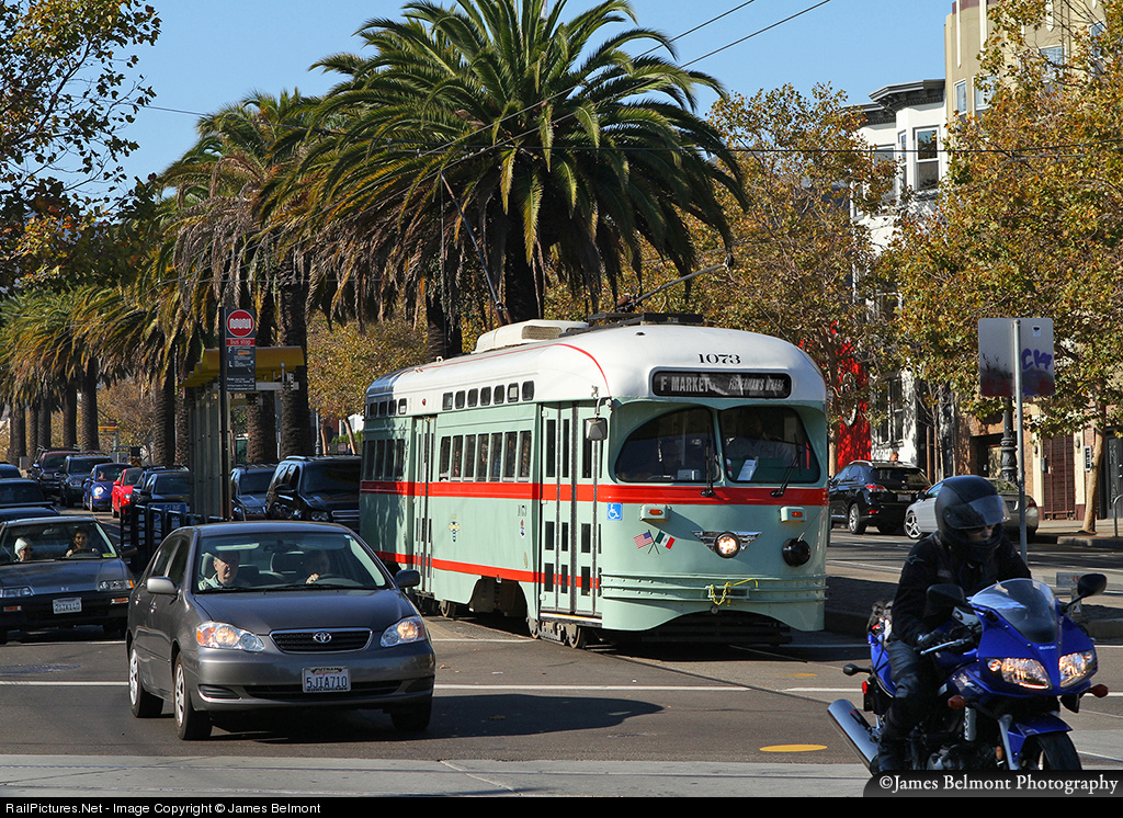With traffic congestion on Market Street at Church, the morning rush in San Francisco is still in effect. Car 1073 is dressed in the livery of the El Paso, Texas & Juarez, Mexico system, the only PCC streetcar line to ever cross an international border.