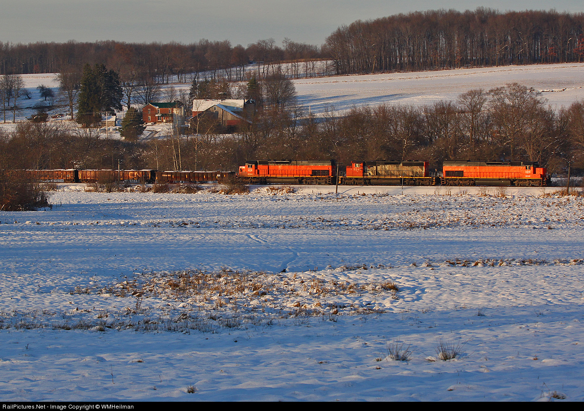 | Two Bessemer tunnel motors sandwich a CN SD40-2W on the daily ore train bound for North Bessemer. The CN 5245 was brought in to temporarily replace BLE 905, which was damaged in a grade crossing incident awhile back. Here, the mismatched trio roll through the snow covered farmlands near Fredonia, PA. |