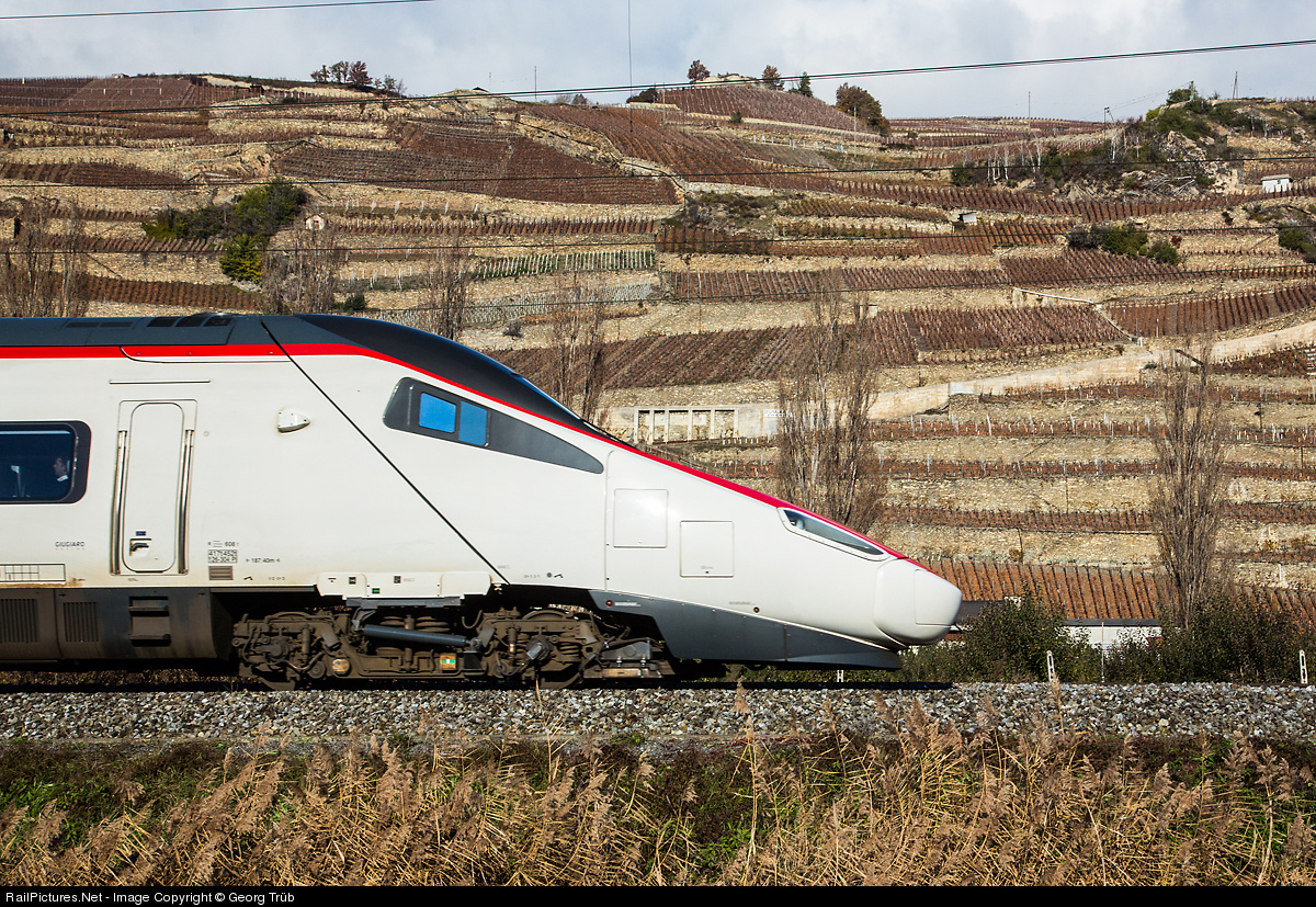 | Giorgio Giugiaro designed highspeed tilting train ETR 610 is running with 150 km/h through the Valais from Milan to Geneva, below the empty vineyards of Molignon. |