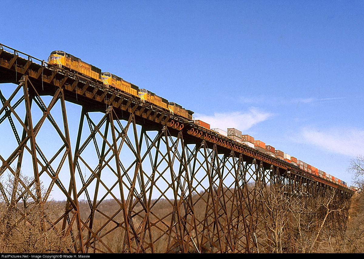 A westbound stack train crosses the huge Kate Shelley Bridge. Construction on the new bridge was just getting started at the time of the photo.