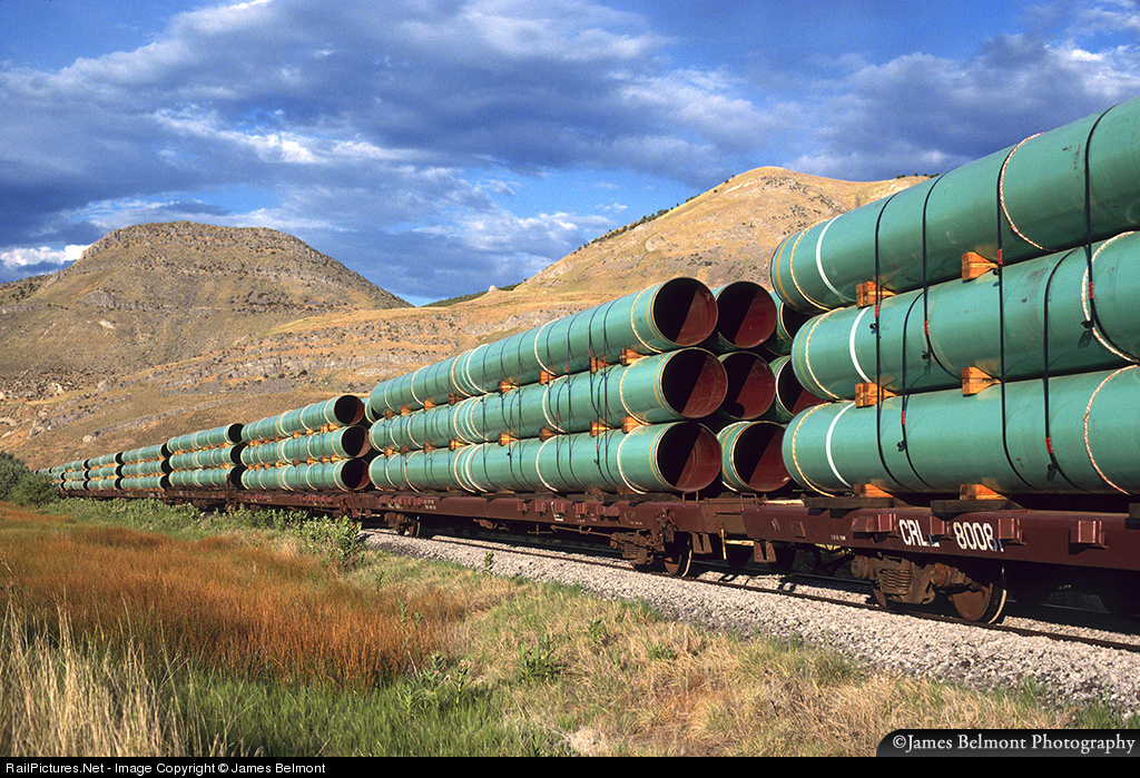 Fourteen cars of pipe creep along at 5 mph through Utah's Goshen Valley, bound for Elberta where it will be used to help construct a 1,679 mile natural gas pipeline line extending from southwestern Wyoming to Bakersfield, California. The pipeline will supply local gas distribution companies, power plants, and heavy industry in Utah, Nevada, and California, owned and operated by the Kern River Gas Transmission Company.