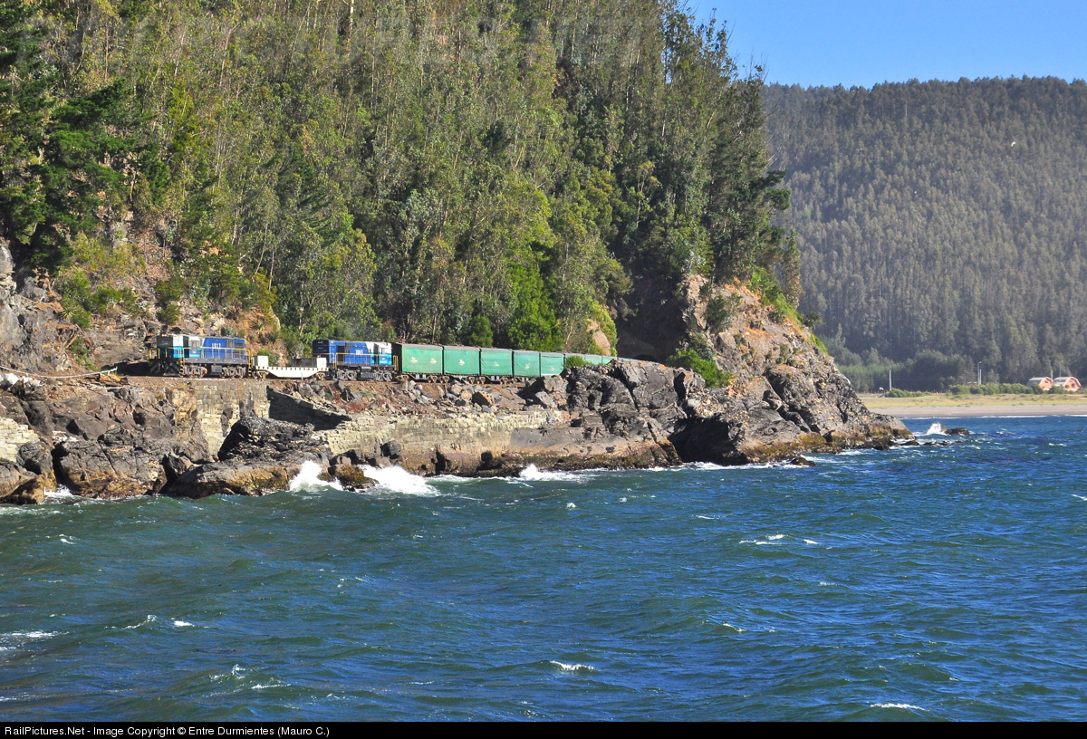 Northbound FEPASA train load of cellulose and empty chemical tanks, crosses 12 tunnels on a beautiful coastal stretch and difficult to access, there is no possibility to reach by car, just walking down the railroad for several miles, and trying to achieve some location without risking to fall into the rocks. This area is known as "Colcura", the train after crossing tunnel No. 10, bordering the pacific ocean.