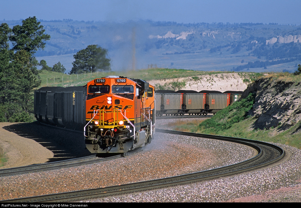 New BNSF GE ES44AC No. 5760 leads an eastbound coal load up the grades of Crawford Hill west of Belmont, Nebraska, on May 20, 2006.