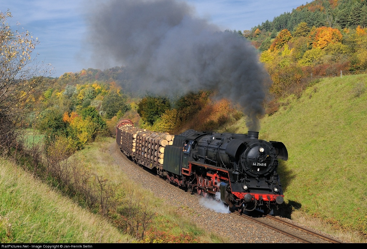 The organizer team Lohr / Riedel enabled again that steam-operated regular and Photo trains could roll for a large, even international, audience through the autumnal Werra valley, here is the 44 2546-8 with a timber train on 08/10/2010 in the S-curve between Walldorf and Meiningen.