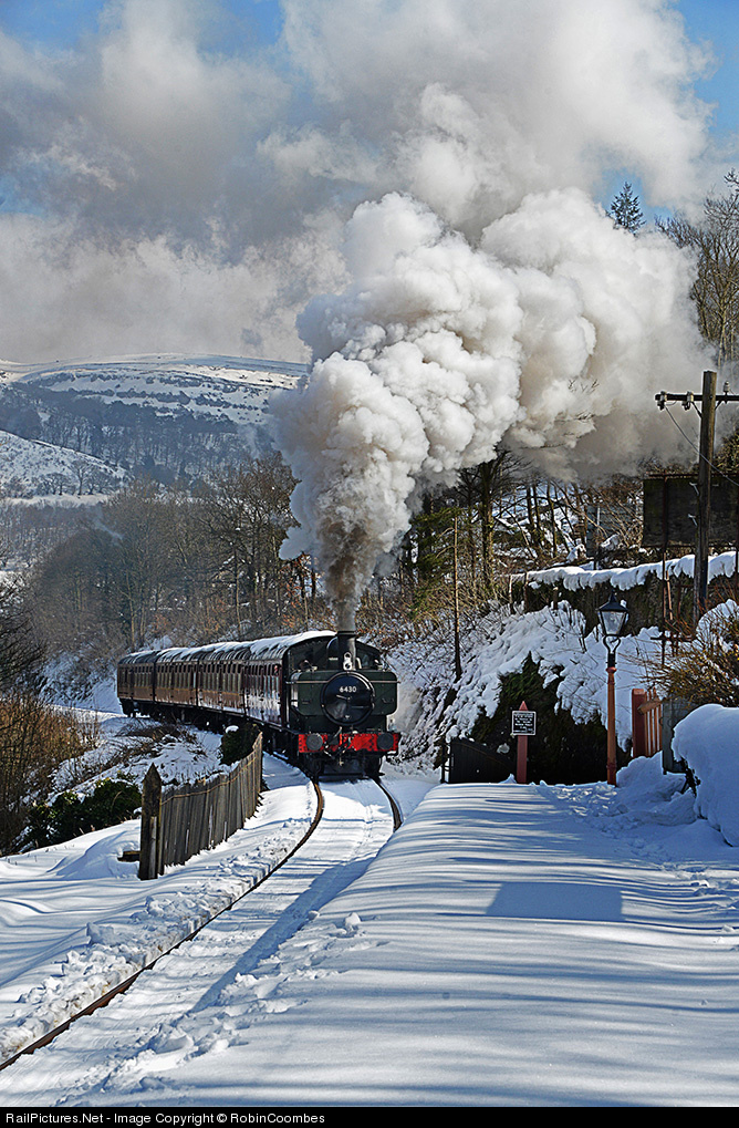 GWR Pannier tank No 6430 slogs up the steep climb to Berwyn Station with the first train of the day after an unusually late heavy snow fall.