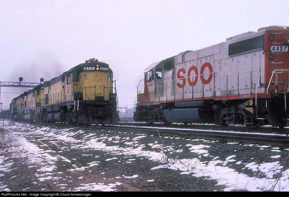 | The Soo, LS&I and C&NW shared track west of Eagle Mills to near Ishpeming. This was CTC controlled by the LS&I control operator in Eagle Mills. I had been following Soo 4407 westbound out of Marquette on a local freight when it came to a stop at the signal in Negaunee. After about a 10 minutes wait on a chilly snowy April morning the C&NW 6721,6710 and 6717 showed up with an ore load out of Ishpeming bound for Escanaba. |