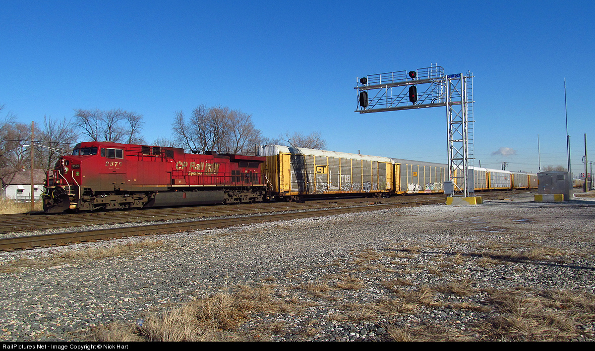 With a signal into Blue Island Yard, CP 9570 heads west with a vehicle train.
