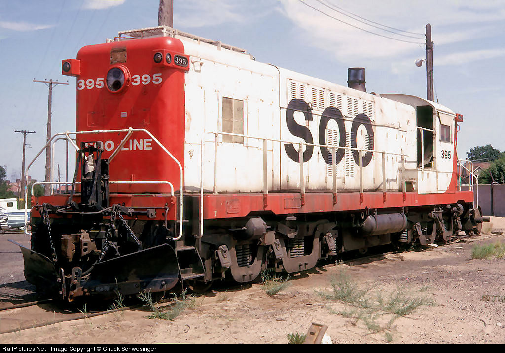 | Ex Baldwin demo unit 1600 ended up on the DSS&A and was one of a few to end up in the Soo's red white and black scheme. It was retired in late 1965 and spent awhile being picked clean of usable parts on the remaining serviceable Ex DSS&A Baldwins. Note the interesting plow set up on the unit. This slide I traded for years ago and was shot by Karl Henkels. |