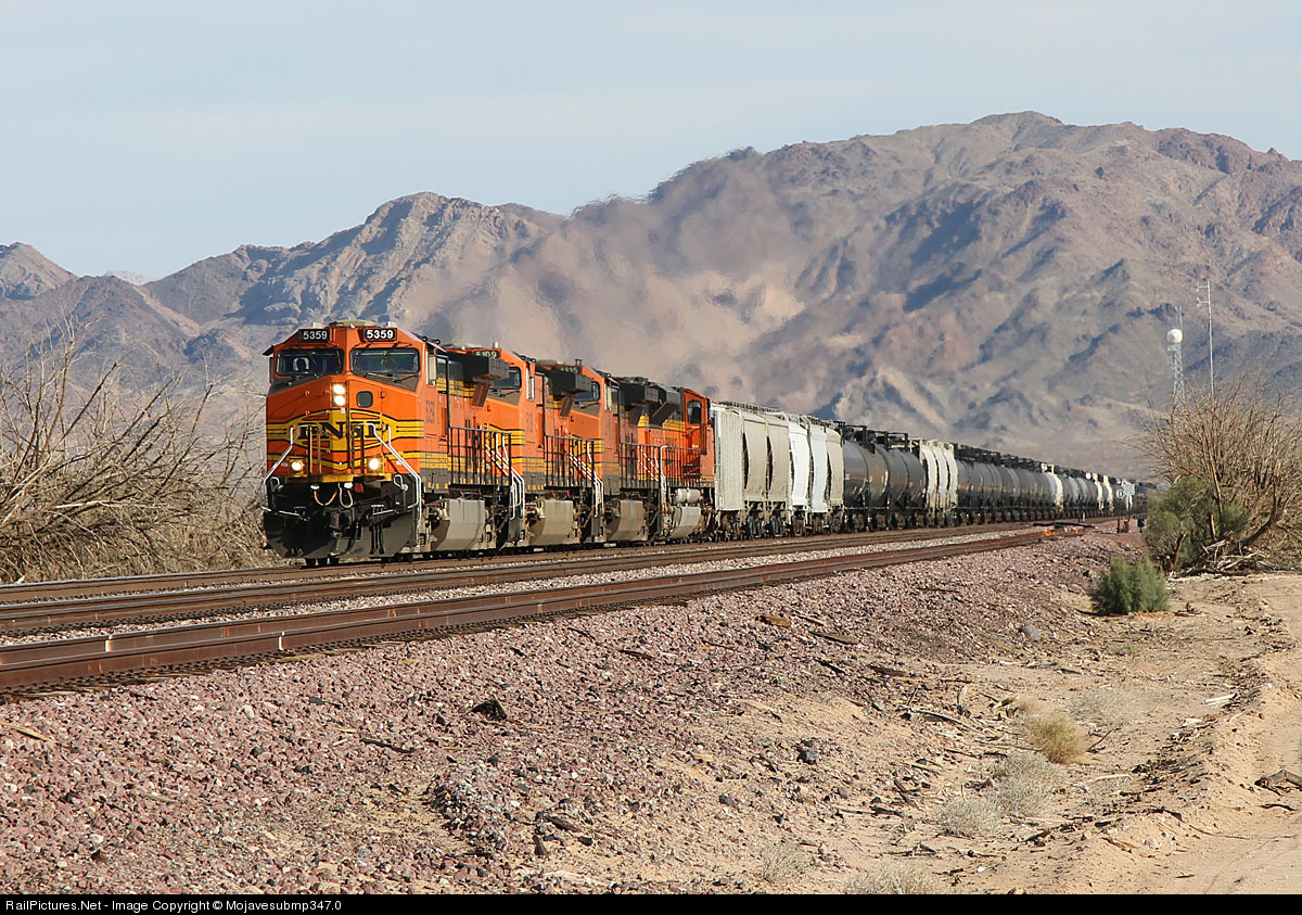| Running 4th in a fleet of 7 westbounds, BNSF 5359 blasts through Cadiz in the early afternoon. The train will take the siding at Amboy for 3 hotshots to run around. |