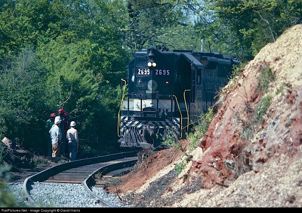 | Southern 2695 backs a wreck train around the curve just north of downtown as a work crew waits near the wreck site. The Man O' War has been gone for years, but the curve still has a fair degree of superelevation. That red clay looks a bit strange because it is covered with wood chips from an upside-down hopper on top of the bank. |